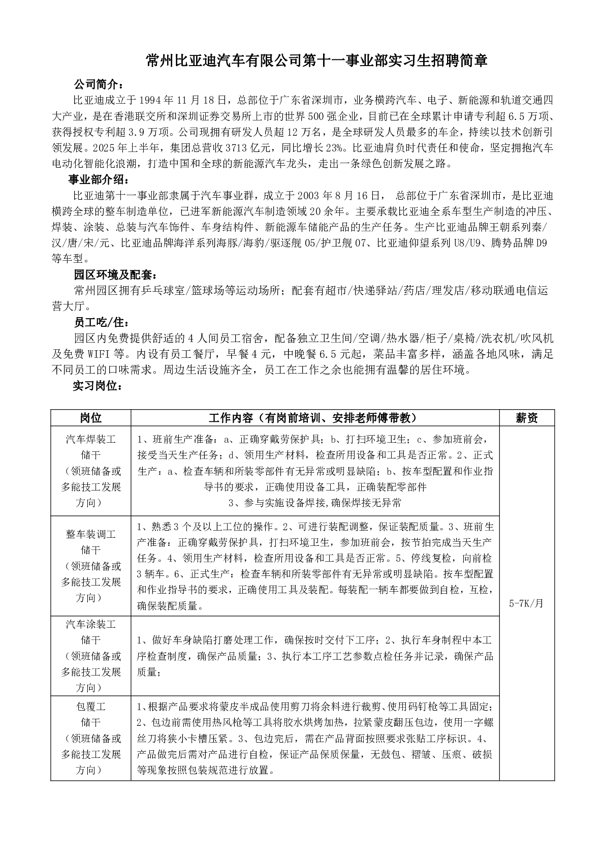 20250052常州比亚迪汽车有限公司第十一事业部(实习生)招聘信息