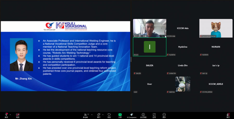 10月30日上午,我校智造学院智能焊接技术专业张鑫老师带领张鹏宇、相佳良、卢炜成等三名学生,通过线上培训形式,面向马来西亚双溪毛糯职业学院(Kolej Vokasional Sungai Buloh)的30余名师生开展《换热器生产中的人机协作创新》主题培训。马来西亚双溪毛糯职业学院研究与创新关系部主任阿兹鲁希沙·宾·马朱尼先生(Ts. Azrulhisham bin Marjuni),产业与机构部主任伊扎瓦妮·宾蒂·易卜拉欣女士(Pn. Izawany binti Ibrahim),机械与制造部主任莎丽扎·宾蒂·莫哈末·阿都·瓦哈女士(Pn. Saliza binti Mohd Abd Wahab),传播与企业事务部主任努尔·艾因·夏姆西娜·宾蒂·易卜拉欣女士(Pn. Nur Ain Syamsina binti Ibrahim)共同出席线上开班环节。
