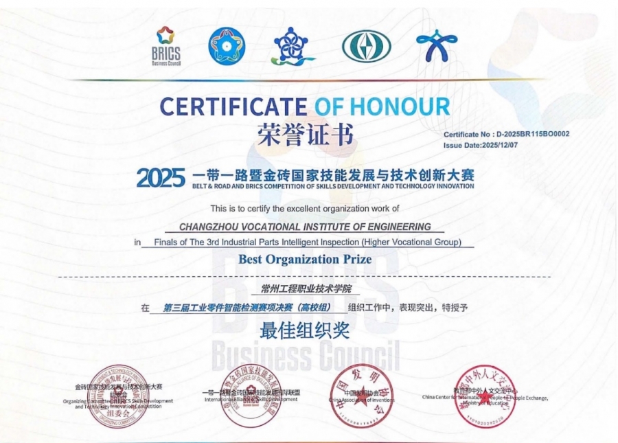 12月7日,2025一带一路暨金砖国家技能发展与技术创新大赛第三届工业零件智能检测赛项决赛在河南工业和信息化职业学院圆满落幕。智造学院机械制造及自动化专业孙德松、邓守层团队指导的学生宋奇蔚、王新宇凭借扎实的专业功底与娴熟的实操技能在比赛中脱颖而出,斩获大赛一等奖和三等奖各1项,其中一等奖获得晋级2026年北非国际赛资格,我校被授予“最佳组织奖”。