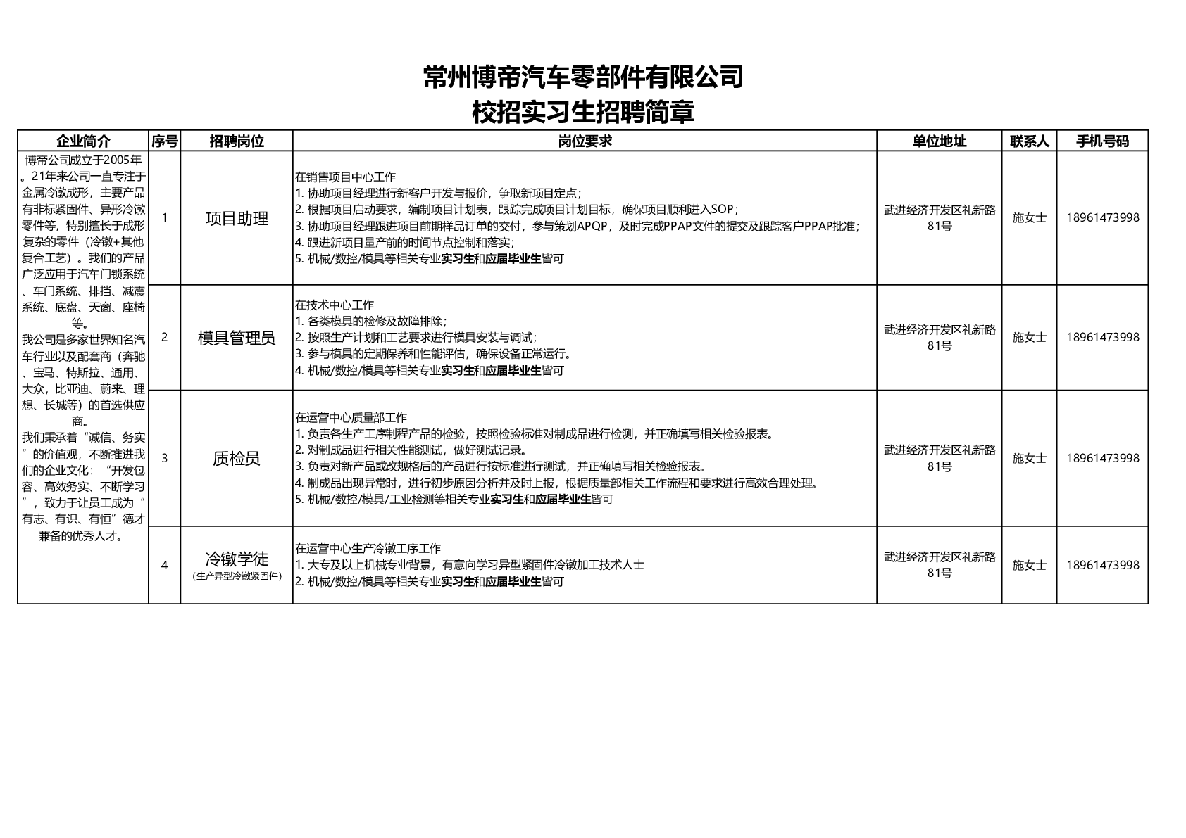 20260024常州博帝汽车零部件有限公司招聘信息