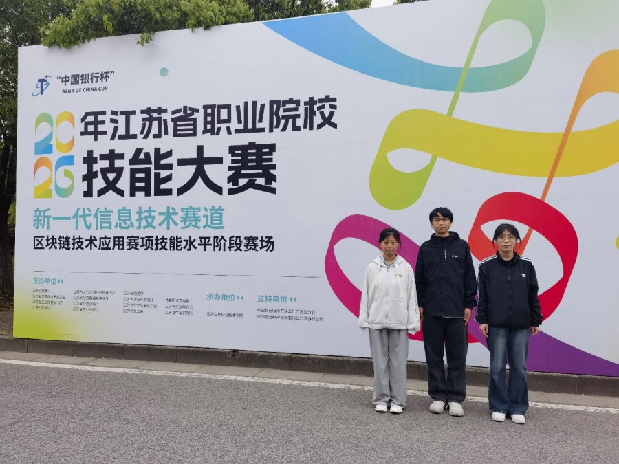 4月18至21日,2026年江苏省职业院校技能大赛区块链技术应用赛项在江苏信息职业技术学院举行。来自全省38支学生代表队114名参赛选手同台竞技、激烈角逐。经过紧张比拼,我校智造学院耿亚、邵姣两位老师指导的马茜、何宏劲、曹耀匀组成的学生代表队凭借娴熟的实操技能和默契的团队协作,荣获团体二等奖,充分展现了我校在区块链技术领域的育人成果与学子风采。